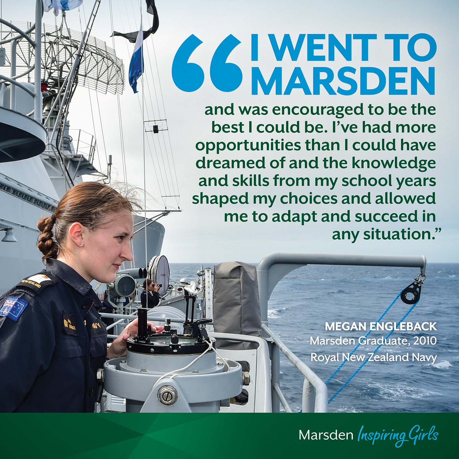 After graduating from Marsden in 2010 Megan Engleback sailed through her training as a warfare officer in the Royal New Zealand Navy. She finished Joint Dux in both the Advanced Officer of the Watch course (Alpha's) 2016 and Basic Officer of the Watch course (Bravo's) 2015.